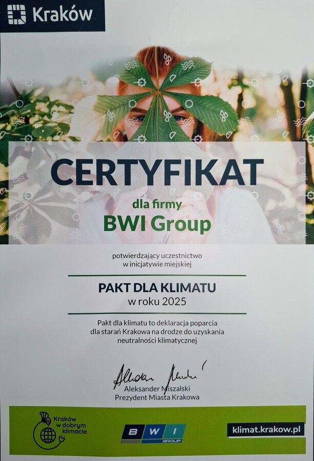 Po raz trzeci BWI Group w Balicach przystąpiło do Paktu dla klimatu - inicjatywy Urzędu Miasta Krakowa, która zrzesza przedsiębiorców z Krakowa i okolic oferując im platformę do wzajemnej motywacji w kierunku osiągnięcia neutralności klimatycznej.